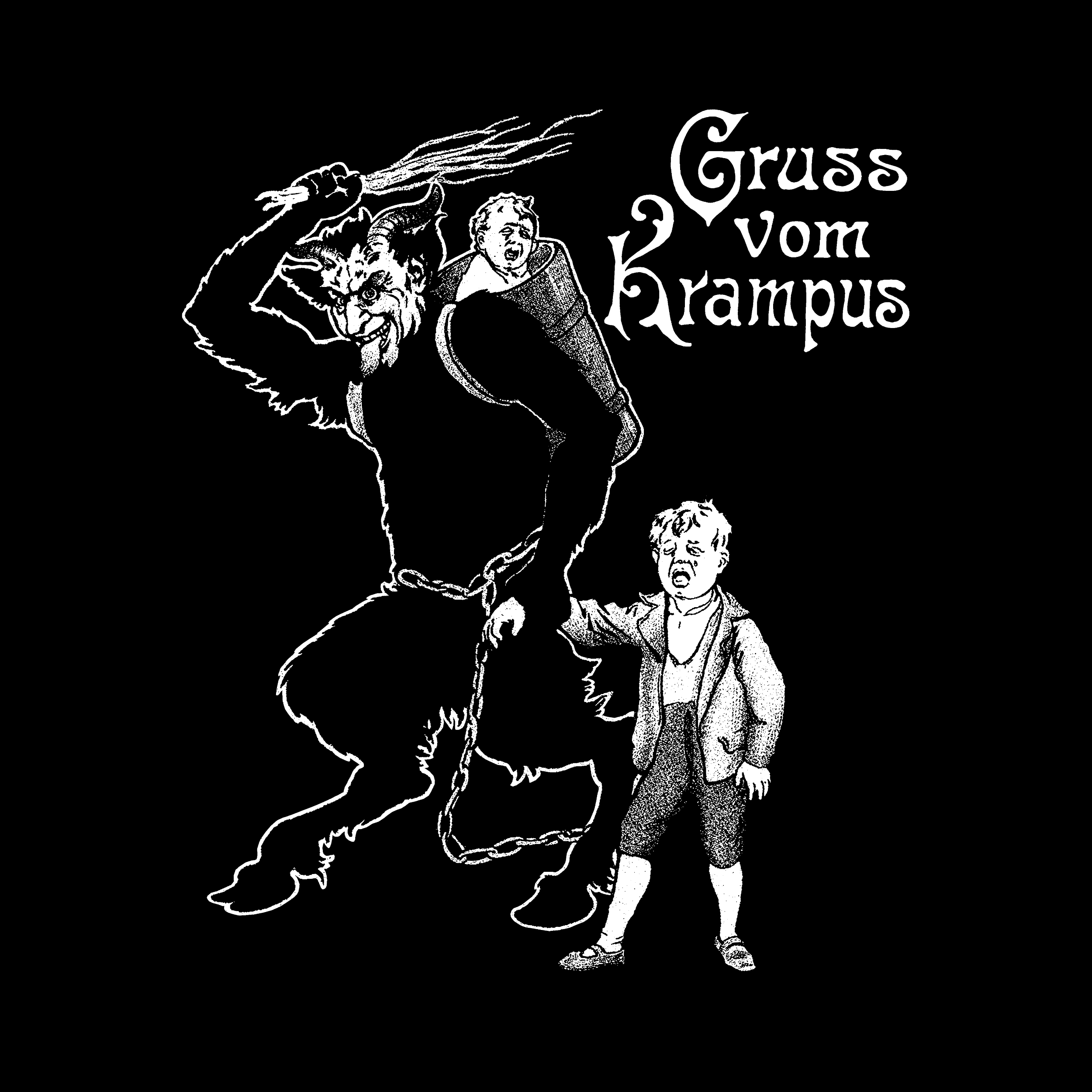 Embrace the darker side of holiday cheer. Featuring the legendary Christmas demon himself, Krampus! Krampus clutches a switch and a chain, ready to deliver justice to naughty children. The text reads “Gruss vom Krampus” or “Greetings from Krampus."